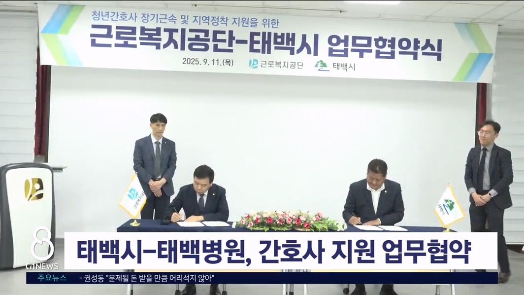 태백시와 근로복지공단 태백병원은 오늘(11일) 청년간호사 태백정착지원 사업 추진을 위한 업무협약을 체결했습니다.