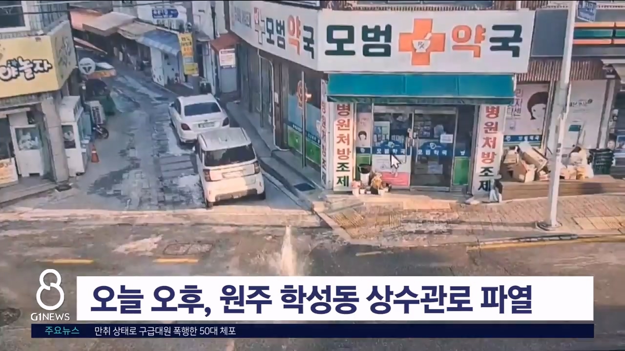 오늘(14일) 오후 3시 30분쯤 원주시 학성동 일원 상수관로가 파열돼 인근 30여 가구에 물 공급이 중단됐습니다.