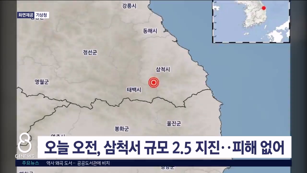 오늘 오전, 삼척서 규모 2.5 지진..피해 없어