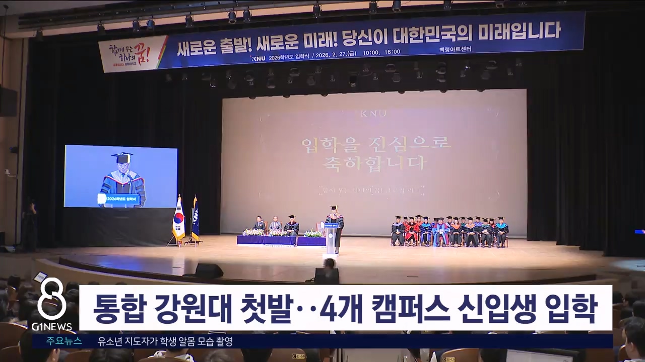 다음 달 1일 출범하는 1도 1국립대 '통합 강원대'가 어제(26일) 강릉과 삼척캠퍼스에 이어 오늘(27일) 춘천과 원주캠퍼스에서 신입생을 맞았습니다.