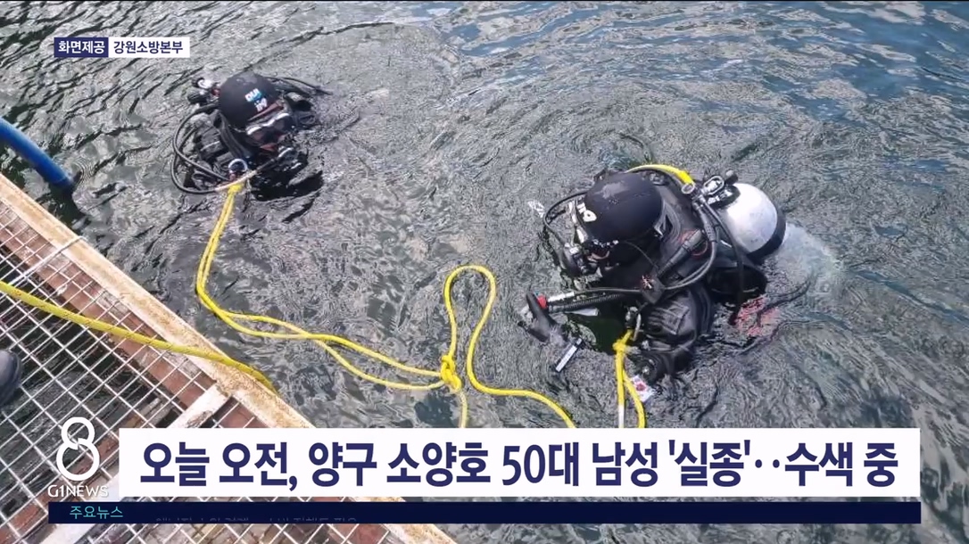 오늘(13일) 오전 9시 51분쯤 양구군 정중앙면 소양호의 한 바지선에서 50대 남성 1명이 실종돼, 경찰과 소방당국이 수색 작업을 벌이고 있습니다.