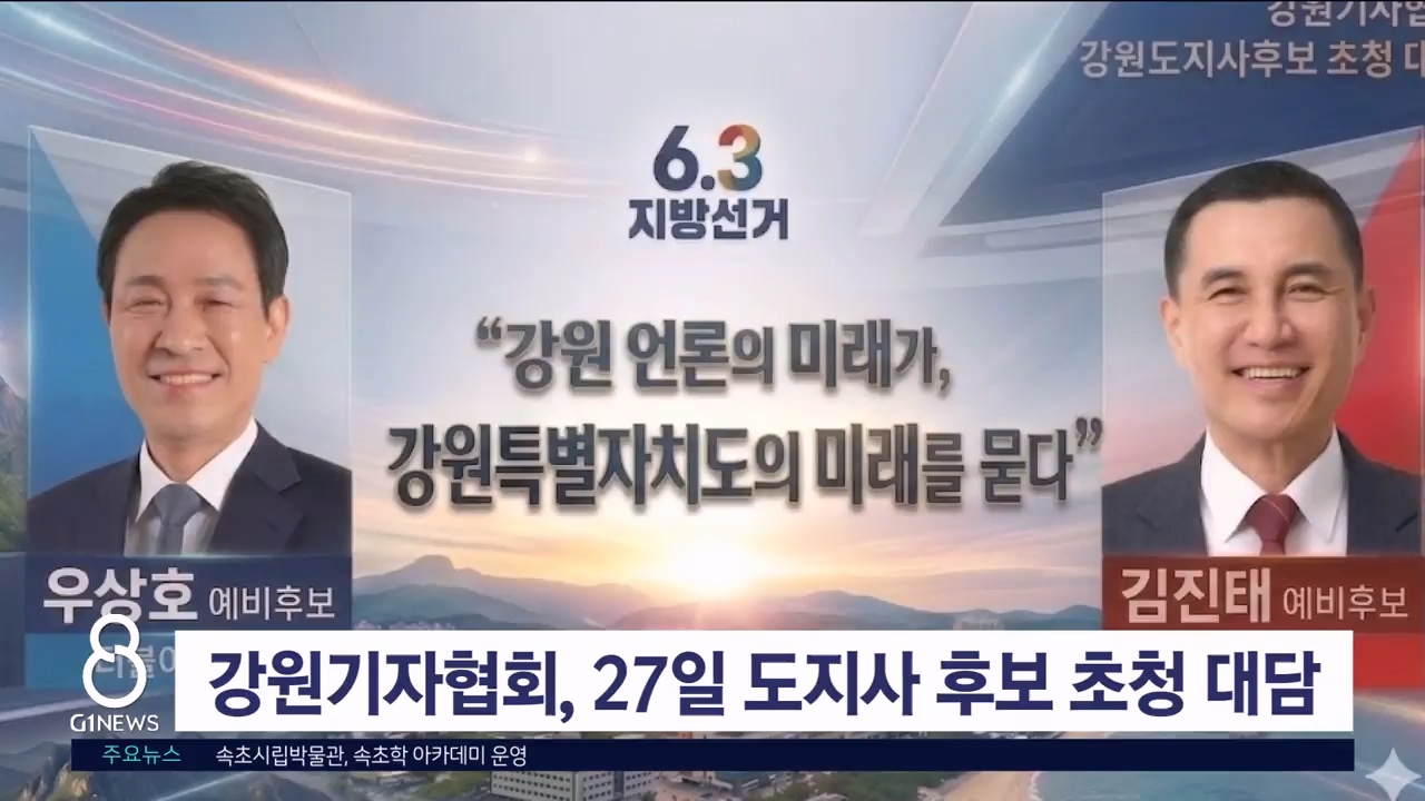 강원기자협회는 오는 27일 강원CBS 공개홀에서 강원자치도지사 후보 초청 대담 '강원 언론의 미래가, 강원자치도의 미래를 묻다'를 개최합니다.