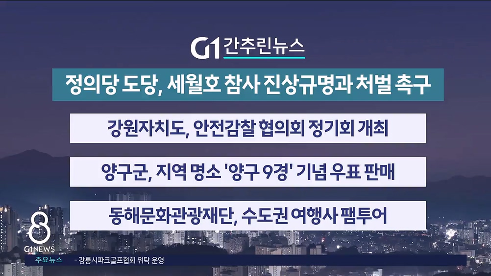 경찰, 직장 괴롭힘 양양 공무원 구속 송치 직장 내 괴롭힘 의혹을 받고 있는 양양군청 공무원이 검찰에 넘겨졌습니다. 속초경찰서는 강요와 상습 폭행 등의 혐의로 양양군 공무원 A씨를 구속 송치했다고 밝혔습니다. A씨는 사실상 지휘 관계에 있던 환경미화원 3명에게 강요와 폭행, 협박, 모욕 등을 한 ... 철원군, 국토부 도시재생 스마트 사업 공모 선정 철원군이 국토교통부가 주관한 '2026 생활밀착형 도시재생 스마트 기술 지원 사업 공모'에 선정돼 국비 7억 원을 확보했습니다. 이번 사업은 신철원 지역 샘나는 마을에 스마트 서비스를 구축해 교통과 안전 등 주민 생활과 밀접한 분야를 개선하는 겁니다. 총... (기획.2) 기본소득 효과 입증..정선, 도입 전부터 전입 증가 [앵커] 정선 농어촌 기본소득 보도 오늘도 이어갑니다. 경기도 연천군 청산면은 지난 2022년부터 농촌 기본소득을 지급했습니다. 인구가 감소한 지역내 다른 읍면과 달리 인구가 소폭 증가했는데요. 정선군도 벌써 효과가 나타나고 있습니다. 송승원 기자... 동해시, 내년부터 상하수도 요금 인상 동해시가 내년부터 상하수도 요금을 인상합니다. 가정용 기준 상수도 요금은 1톤당 950원에서 1,220원으로, 하수도 요금은 660원에서 820원으로 조정됩니다. 다자녀 가구의 경우, 2자녀 가구는 월 최대 5톤, 3자녀 이상 가구는 최대 12톤까지 요금... 강원교육청, 교육부 홍보 우수사례 기관 선정 강원자치도교육청이 교육부가 실시한 '2025년 홍보 우수 사례 선발'에서 우수 기관으로 선정됐습니다. 강원교육청은 이번 평가에서 대도민 정책 소통을 활발히 하고, 국민 체감도, 독창성 등 부분에서 높은 점수를 받았습니다. 앞서 강원교육청은 지역 소멸 ... 영월군, 오는 16일 청령포원 야간 개장 영월군이 오는 16일부터 내년 3월까지 동서강정원 청령포원을 야간에도 개장합니다. 폐장 시간을 기존 오후 5시에서 밤 9시까지로 연장하고, 크리스마스트리와 경관 조명을 설치해 낮과는 또 다른 분위기를 선보일 계획입니다. 청령포원은 4대강 사업의 일환으로... 오늘 오전, 양양서 산불..1시간 여만에 진화 오늘(10일) 오전 10시 38분쯤 양양군 손양면 일대 주택 인근에서 난 불이 산불로 번졌습니다. 산림과 소방 당국은 헬기 10대와 진화 장비 등을 투입해 1시간 여만에 진화를 완료했습니다. 당국은 정확한 화재 원인을 조사 중입니다. 내일 대체로 흐려..“오전부터 도 전역 눈” 끝으로 날씨입니다. 내일(11일) 강원자치도는 대체로 흐린 가운데, 오전부터 도 전역에 눈이 내리겠습니다. 예상되는 눈의 양은 3에서 8cm로, 많은 곳은 10cm 이상입니다. 아침 최저기온은 영하 1도에서 영상 8도, 낮 최고기온은 영서권 영상 7... 춘천시장 출마 선언 정광열, 시 현안 쓴소리 최근 춘천시장 출마를 선언한 정광열 강원자치도 투자유치자문관(전 강원자치도 경제부지사)이 오늘(10일) 춘천시청 기자실을 찾아, 광판리 기업혁신파크 등 시 현안 사업에 대한 목소리를 냈습니다. 일각에선 선거 전 시 현안에 다양한 목소리를 내는 ... 사북사건 국가 사과 국회 결의안 제출 [앵커] 여러분 안녕하십니까? G1뉴스에서는 지난 2023년 정선 사북사건을 집중 보도해 드린 적이 있습니다. 1980년 탄광 노동자가 참여한 민주화 운동이자, 공권력에 의한 인권 침해 사건인데요. 45년이 지난 지금도 정부의 공식 사과나 피해자 ... 강원소방, 도 전역 겨울철 '화재주의보' 발령 강원소방본부가 최근 건조해진 날씨에 화재 사고가 잇따르자, 도 전역에 '겨울철 화재주의보'를 발령했습니다. 소방당국에 따르면 지난 11월 1일부터 약 한 달간 도내엔 전년 대비 4.8% 증가한 총 197건의 화재가 발생한 것으로 나타났습니다. 소방은 심... 춘천시 "2027년까지 교통사고 20% 절감" 춘천시가 오는 2027년까지 생활권 교통사고 20% 감축을 위한 종합 대책을 마련했습니다. 육동한 춘천시장은 오늘(9일) 시청 브리핑룸에서 기자회견을 열고, 춘천경찰서, 한국교통안전공단 등 유관 기관과 함께 '교통안전 개선계획'을 발표했습니다. 계획에... 원주 현안해결을 위한 범시민 협의단체 발족 원주 지역 주요 현안 사업 해결을 위한 범시민 협의단체가 발대식을 갖고, 본격적인 활동에 나섭니다. 원주 지역 28개 시민 사회단체가 참여한 '원주시 현안해결을 위한 범시민 협의단체'는 오늘(9일) 시청 대회의실에서 발대식을 가졌습니다. 협의단체는 원주공... (기획.2) 기본소득 효과 입증..정선, 도입 전부터 전입 증가 [앵커] 정선 농어촌 기본소득 보도 오늘도 이어갑니다. 경기도 연천군 청산면은 지난 2022년부터 농촌 기본소득을 지급했습니다. 인구가 감소한 지역내 다른 읍면과 달리 인구가 소폭 증가했는데요. 정선군도 벌써 효과가 나타나고 있습니다. 송승원 기자... 저출산·지역소멸..극복 방안 모색 [앵커] 저출생으로 인한 지역소멸 극복은 강원자치도가 직면한 과제입니다. 지역소멸 문제 해결을 위한 전문가 포럼이 열려 눈길을 끕니다. 보도에 김기태기자입니다. [리포터] 올초 강원연구원이 발표한 자료에 따르면 도내 193개 읍면동 ... 도내 중기 과반 "외국인 노동자 제재 장치 필요" 도내 중소기업 절반 이상은 '불성실한 외국인 인