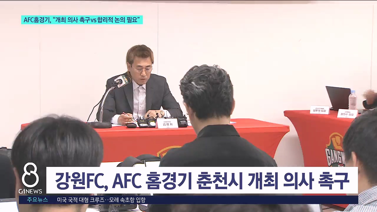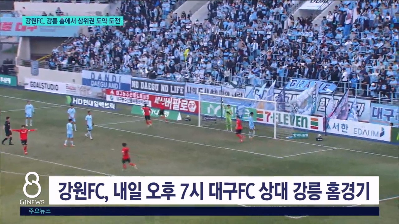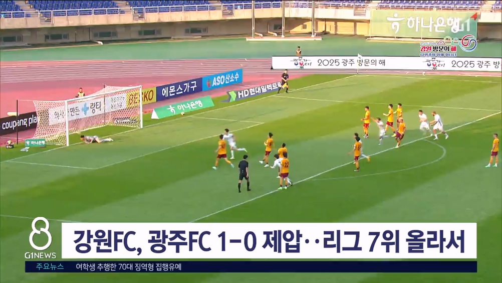 "스포츠 도시 구현" 춘천시 체육인의 밤 개최 춘천지역 체육인들의 축제인 '춘천 체육인의 밤' 행사가 오늘(10일) 춘천 스카이컨벤션에서 열렸습니다. 육동한 춘천시장과 이강균 춘천시체육회장 등 체육인 200여 명이 참석한 가운데 열린 이날 행사에선, 스포츠 도시 춘천 구현과 체육계 발전을 위한 결의... 강릉하이원아레나, 3년 연속 최우수 경기장 [앵커] 여러분 안녕하십니까. 일요일 G1 AI뉴스 시작하겠습니다. 프로축구 K리그1 강원FC의 홈 구장인 강릉하이원아레나, 강릉종합경기장이 3년 연속 '그린 스타디움'에 선정됐습니다. 구장 관리에 있어 국내 다른 어떤 경기장보다 높은 평가를 받은 건데... '2025년 강릉시 체육인의 밤' 개최 '2025 강릉시 체육인의 밤' 행사가 강릉 세인트컨벤션웨딩에서 열렸습니다. 이번 행사에는 김홍규 강릉시장과 권영만 강릉시체육회장을 비롯해 강릉지역 우수선수와 회원종목단체 회원 등 400여 명이 참석했습니다. 강릉시는 전문체육 우수선수에게 장학금을, 체육... 강원FC, 포항에 1대 0 승..리그 5위 마무리 강원FC가 포항 스틸러스와의 하나은행 K리그1 2025 최종라운드에서 승리했습니다. 강원FC는 오늘(30일) 강릉하이원아레나에서 열린 하나은행 K리그1 2025 최종라운드 홈 경기에서 포항 스틸러스에 1대 0으로 이겼습니다. 강원은 후반 16분 모재현의... 강원 FC, 대전 원정서 1-1 무승부..리그 6위 강원 FC가 대전 과의 파이널 A 마지막 원정 경기에서 무승부를 거뒀습니다. 강원은 오늘 대전 월드컵경기장에서 열린 '하나은행 K리그1 2025 37라운드' 대전 하나시티즌과의 경기에서 1대 1로 비겼습니다. 12승 13무 12패, 승점 49점으로 6위를... 제106회 전국체전 강원선수단 환영행사 개최 강원자치도가 오늘(10일) 춘천 스카이컨벤션에서 제106회 전국체육대회 강원선수단 환영 행사를 열었습니다. 이번 행사에는 전국체전 MVP를 차지한 수영 황선우와 대회 5관왕 신솔이, 양재훈 등 선수단과 지도자가 참석했습니다. 강원선수단은 이번 대회에서 ... '제3회 강릉시 노인회장기 파크골프대회' 개최 제3회 강릉시 노인회장기 파크골프대회가 강릉시 입암동 파크골프장에서 열렸습니다. 어르신의 사회적 고립감 해소와 복지 증진을 위해 마련된 이번 대회에는 27개 팀, 144명의 선수 등 모두 200여 명이 참가해 우승을 향한 열띤 경쟁을 벌였습니다. 파크골프... 강원FC, 김천 상무 상대 1대 0 승리 프로축구 강원FC가 어제(8일) 김천종합경기장에서 열린 김천 상무와의 36라운드 원정 경기에서 승리했습니다. 강원FC는 박상혁 선수의 골에 힘입어, 후반 내내 김천 상무의 공세를 막아내며 '1대 0'으로 승리했습니다. 이는 리그 7경기 만에 거머쥔 승리... 강원FC, ACLE 히로시마 원정서 0대 1 패 강원FC가 아시아챔피언스리그 히로시마 원정경기에서 아쉽게 패배했습니다. 강원FC는 어제(4일) 일본 히로시마 사커 스타디움에서 열린 2025-2026 아시아챔피언스리그 엘리트 리그 스테이지 4차전에서 일본 산프레체 히로시마에 0대 1로 패했습니다. 이번... 춘천시, 국제유소년 친선 축구대회 개막 춘천 국제유소년 친선 축구대회가 오늘(4일)부터 7일까지 송암스포츠타운 에어돔에서 열립니다. 이번 대회에는 4개국 12개팀, 200여명의 유소년 선수들이 참가합니다. 해외에서는 춘천 우호도시인 중국 다롄과 몽골 튜브도, 다국적 선수들이 소속된 말레이시... '강원이 나르샤 응원단' 히로시마로 원정 응원길 올라 강원FC의 아시아 챔피언스리그 선전을 기원하기 위해 '강원이 나르샤 응원단'이 일본 히로시마로 원정 응원길에 올랐습니다. 김진태 지사와 김시성 도의장, 도민과 교민 등 200여 명으로 구성된 응원단은 경기가 열리는 일본 히로시마 현지를 찾았습니다. 강... 내가 강원도 "골프왕"..생활체육 골프대회 [앵커] 강원자치도 아마추어 골퍼 최강자를 가리는 대회가 열렸습니다. 골프 저변 확대와 교류의 장 마련을 위해 올해 처음 열린 강원자치도 생활체육 골프대회 현장을 취재했습니다. 정창영 기자의 보도입니다. [리... 강원FC, 전북현대와 무승부..리그 6위 유지 강원FC가 오늘 강릉 하이원아레나에서 열린 전북현대와의 하나은행 K리그1 2025 35라운드 맞대결 0대0 무승부를 기록했습니다. 강원은 11승 12무 12패, 승점 45점으로 5위 FC서울을 3점 차로 추격했습니다. 이날 경기에서 강원FC는 이상헌, ... 전국 테니스인들 평창 집결 [앵커] 평창에선 전국 동호인 테니스 대회가 시작됐습니다. 전국 테니스 동호인들이 사흘동안 평창으로 모이는데요, 스포츠를 통한 지역 상생과 관광 활성화가 기대됩니다. 송승원 기자의 보도입니다. [리포터] 상대 코트의 빈 구석을 찌르는 날카로운... KLPGA 챔피언스투어 8차전 성료 시니어 여자 골프 선수의 대회인 한국여자프로골프협회의 벨라45 챔피언스투어가 성황리에 종료됐습니다. 총상금 7천만 원이 걸린 이번 대회는 챔피언스투어의 최종전으로 지난 27일부터 이틀 동안 횡성 벨라45cc에서 열렸습니다. 최혜정, 홍진주, 김선미 등... "식지 않는 열정"..KLPGA 챔피언스투어 R [앵커] 시니어 여자 프로 골퍼의 열정을 확인할 수 있는 KLPGA 챔피언스투어가 오늘(27일)부터 이틀 동안 횡성에서 펼쳐집니다. 쌀