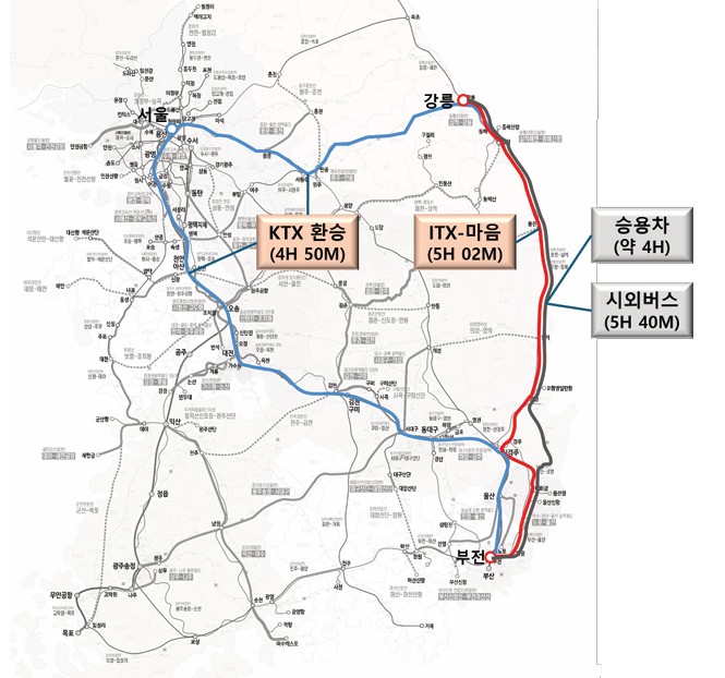 ITX-마음은 강릉-부산 5시간이 소요되기 때문에, 강릉선(KTX-이음)을 이용하여 서울에서 KTX를 환승 이용하는 시간과 유사합니다.
