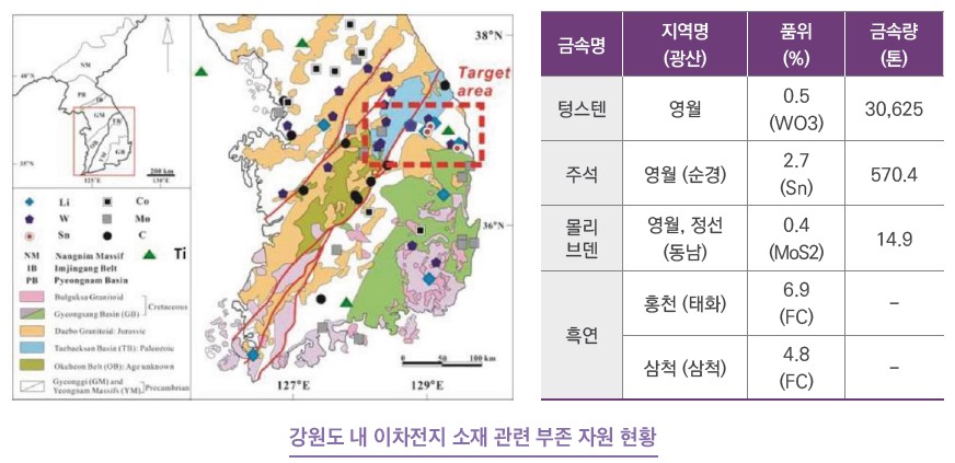 강원연구원은 강원도는 국내에서 보기 드문 광물자원 집적지를 갖고 있어, 이차전지 산업 밸류체인의 전단(前段)을 담당할 최적의 지역이라고 보고 있다.