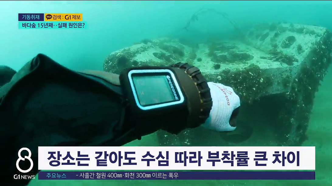 같은 바다숲 조성 현장이지만 수심에 따라 해조류 부착률이 다른 겁니다.