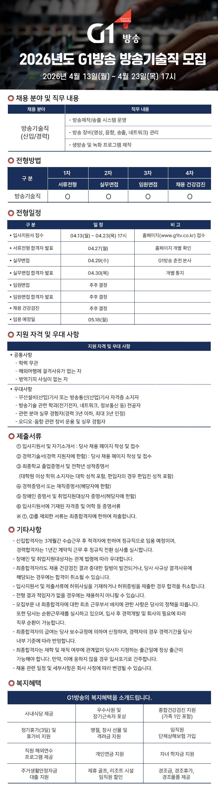 G1방송(이하 "회사"라 함)는 개인정보보호법, 정보통신망 이용 촉진 및 정보보호 등에 관한 법률 등 관련 법령상의 개인정보보호 규정을 준수하며, 지원자들의 개인정보 보호에 최선을 다하고 있습니다.